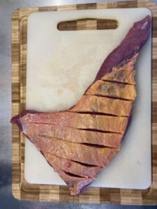 - Skär några långa snitt i fettkappan på triangelstekenca 1 kg triangelstek