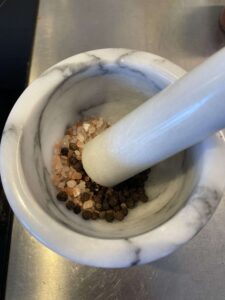 - Mortla himalayasaltet och svartpepparkornen och blanda med muscovadosocker. Klappa in kryddblandningen på köttet.2 tsk Himalayasalt, 2 tsk Muscovadosocker, 2 tsk svartpepparkorn