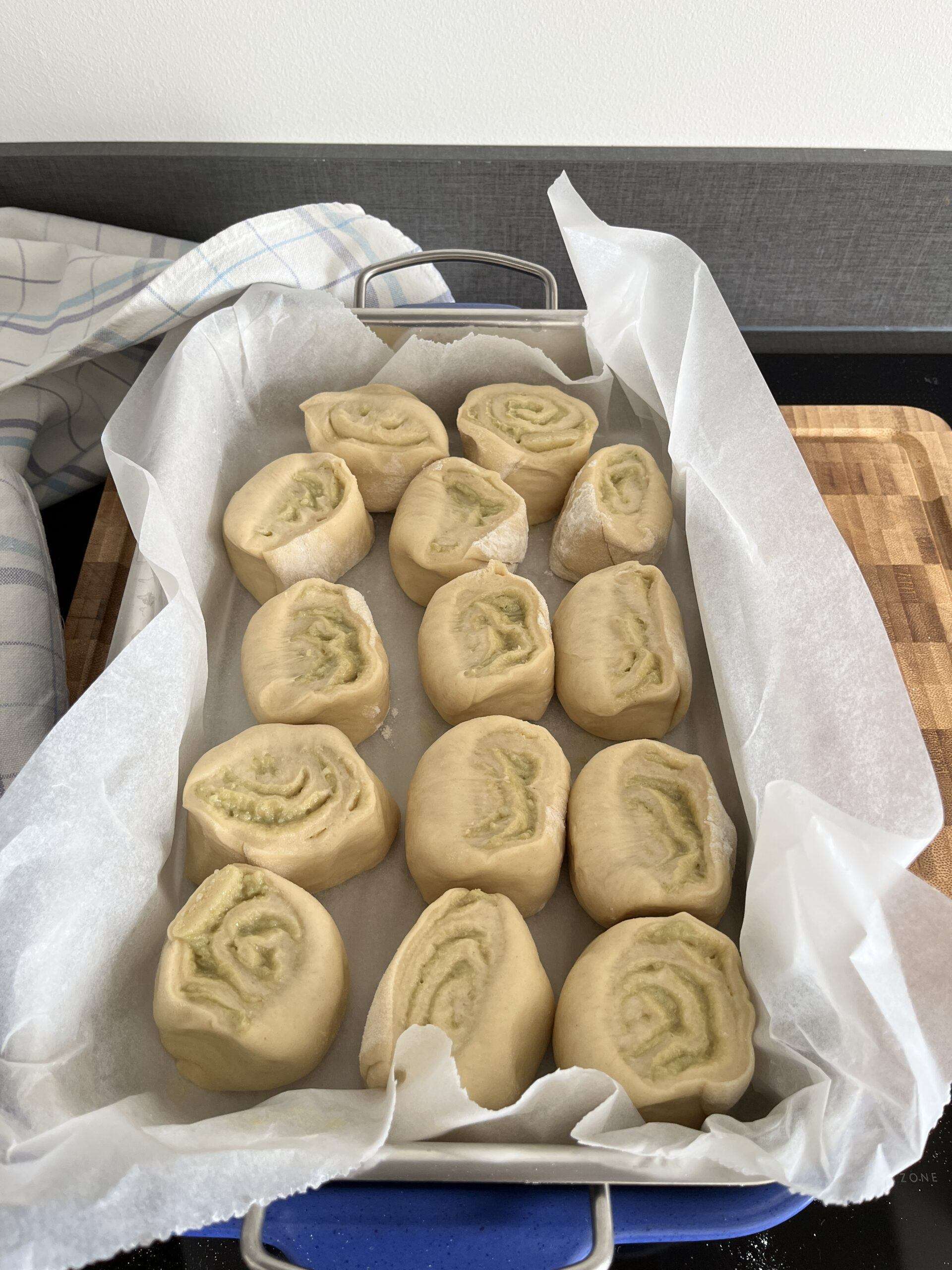 - Lägg upp degen på en mjölad arbetsbänk. Kavla ut den till en rektangel och bred på fyllningen. Rulla ihop till en rulle från långsidan och skär den i ca 3-4 cm breda bitar. Lägg bitarna med snittytan uppåt i en liten långpanna, ca 25 x 35 cm, klädd med bakplåtspapper. Låt jäsa övertäckta i ca 40 min. Sätt ugnen på 225°, eller 200° varmluft.